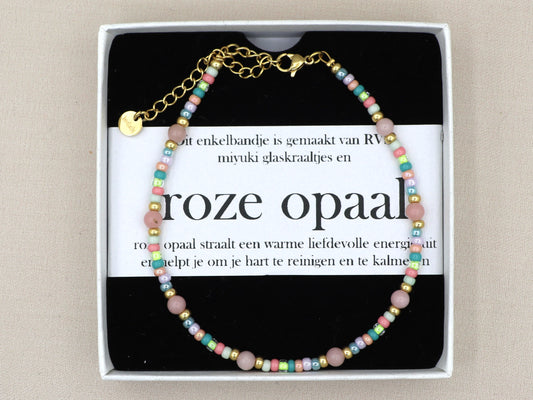 Enkelbandje roze opaal, zilver of goud rvs