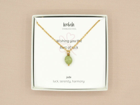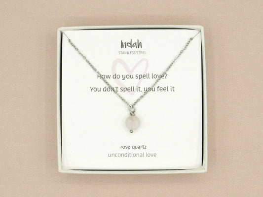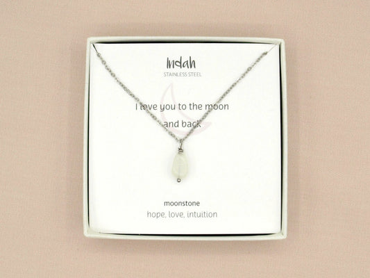 Sieraden van natuursteen en roestvrij staal gepresenteerd op een cadeaukaartje. Achterop het kaartje is ruimte genoeg om een boodschap te schrijven.