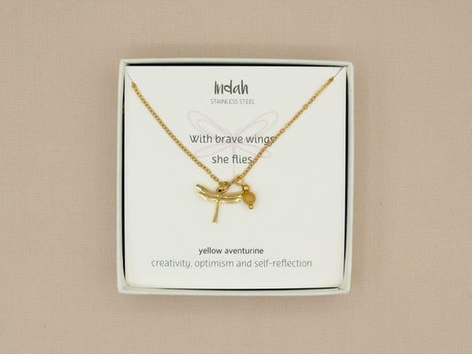 Ketting rock libelle-gele aventurijn, zilver en goud roestvrij staal