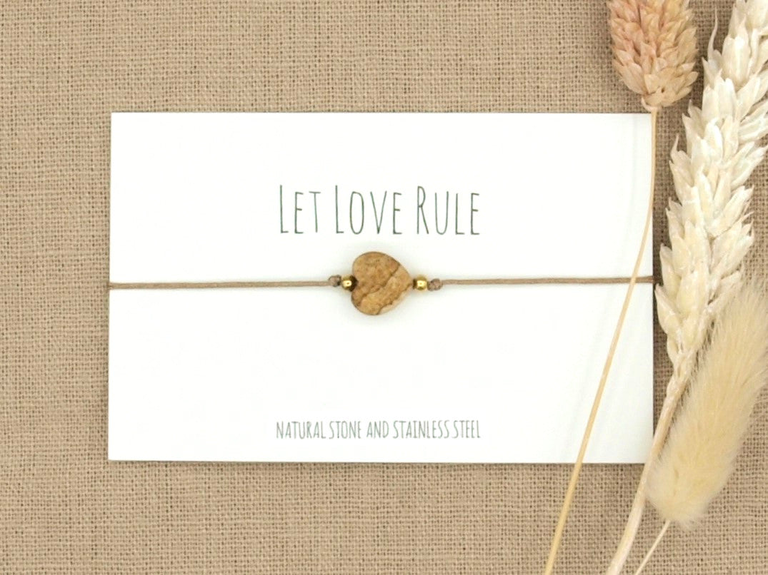 Een fijne verstelbare armband met een jaspis hart steentje (ongeveer 10mm) en rvs kraaltjes in zilver of goud.