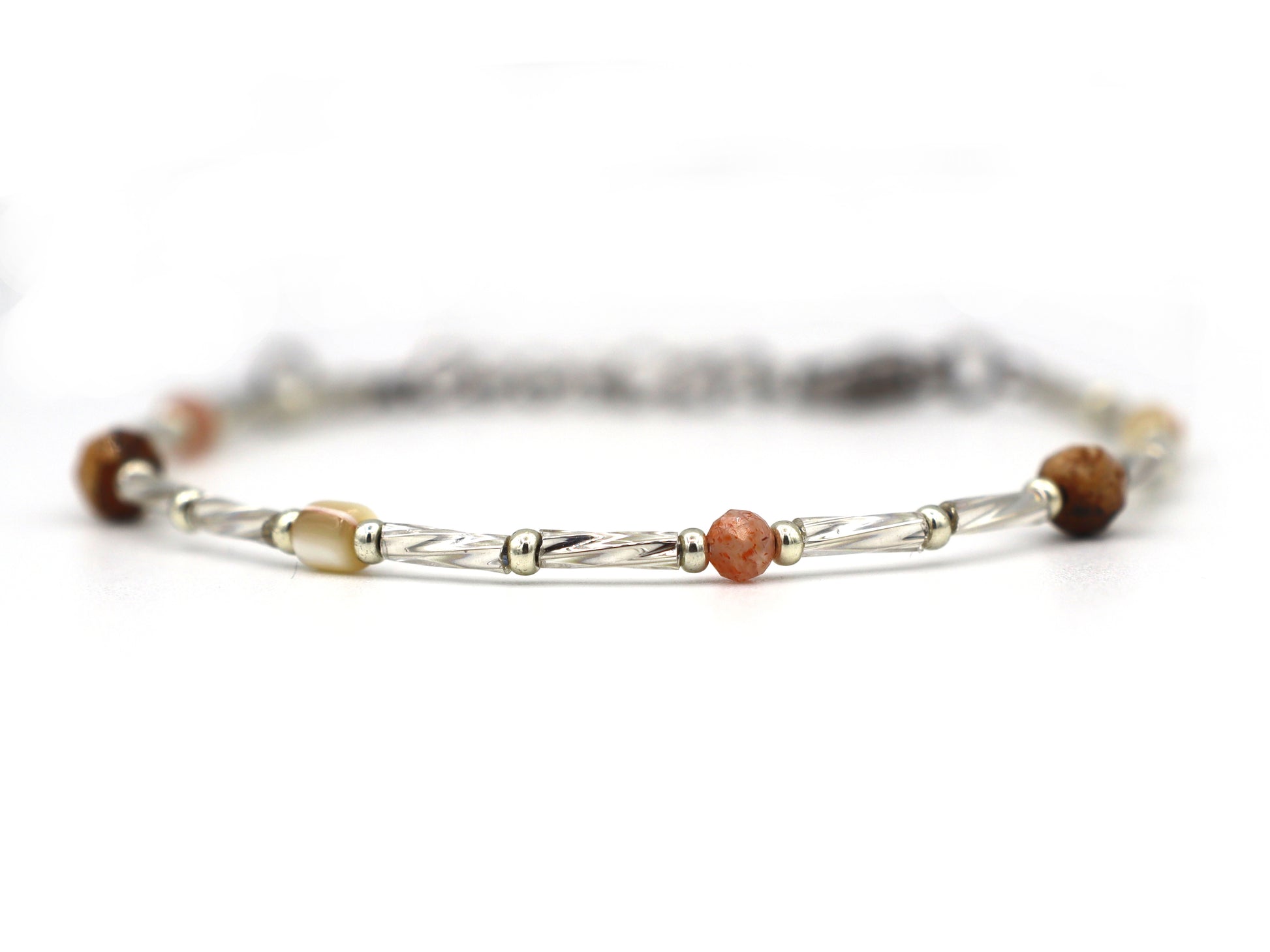 Fira is a fine bracelet with 2mm miyuki beads,glass tubes, faceted sunstone, landscape jasper, shell beads and stainless steel components. The bracelet is due to the extension chain suitable for both small and large wrists (15-18 cm).